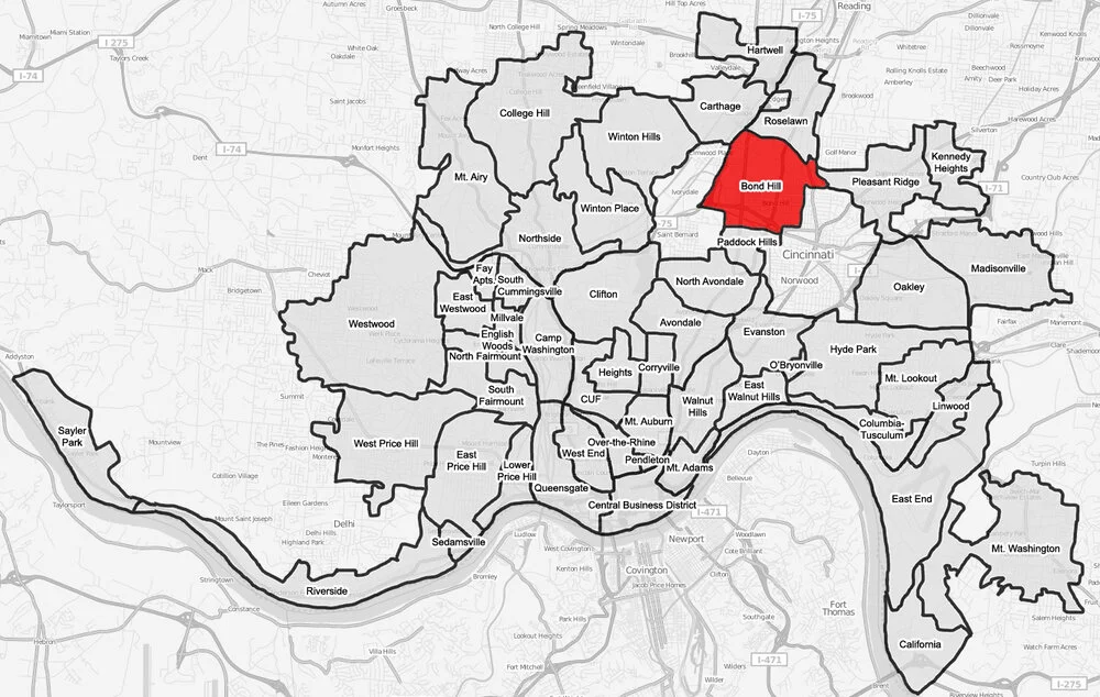 Bond Hill is a neighborhood about 6 miles north of downtown Cincinnati. It was incorporated as a village in 1886 before being annexed into the city in 1903. Named after a sawmill owner, this originally rural area now has over 6,900 residents and is Cincinnati’s 16th largest neighborhood. Paddock and Reading Roads run North/South through the neighborhood. Bond Hill is the only neighborhood that the Norwood Lateral intersects.