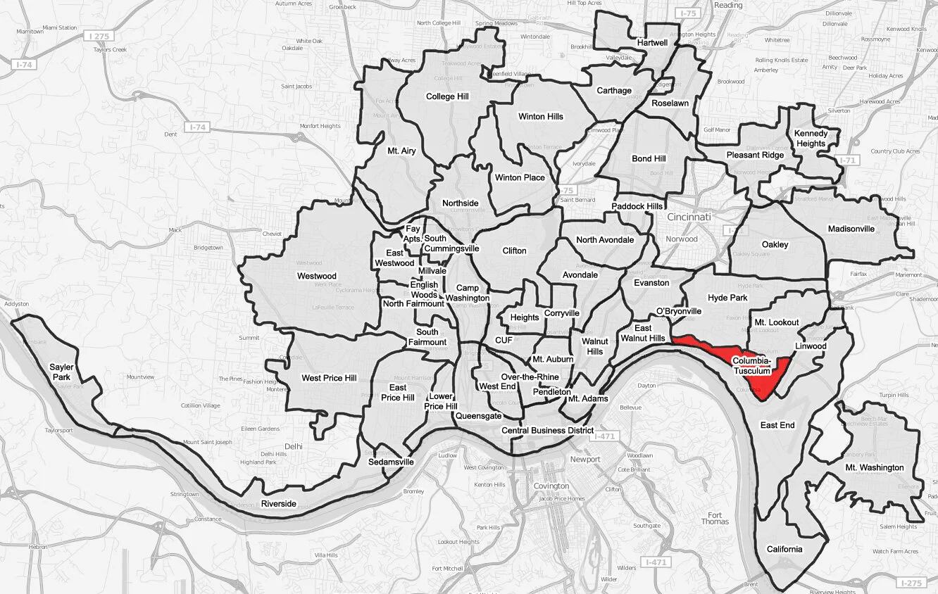 Columbia Tusculum is a neighborhood located five miles east of downtown Cincinnati. This area is considered Cincinnati’s first neighborhood and is home to the “painted ladies” – a distinct set of Victorian homes with multi-colored painted facades. With 1,304 residents, Columbia Tusculum is the 42nd largest neighborhood in the City.