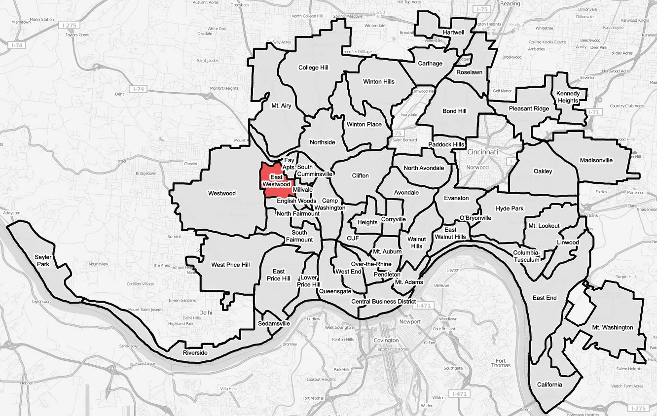 East Westwood is a neighborhood located six miles northwest of downtown Cincinnati. It is home to the 3rd Presbyterian Church which houses many after school activities. With 2,445 residents, East Westwood is the 32nd largest neighborhood in the City.