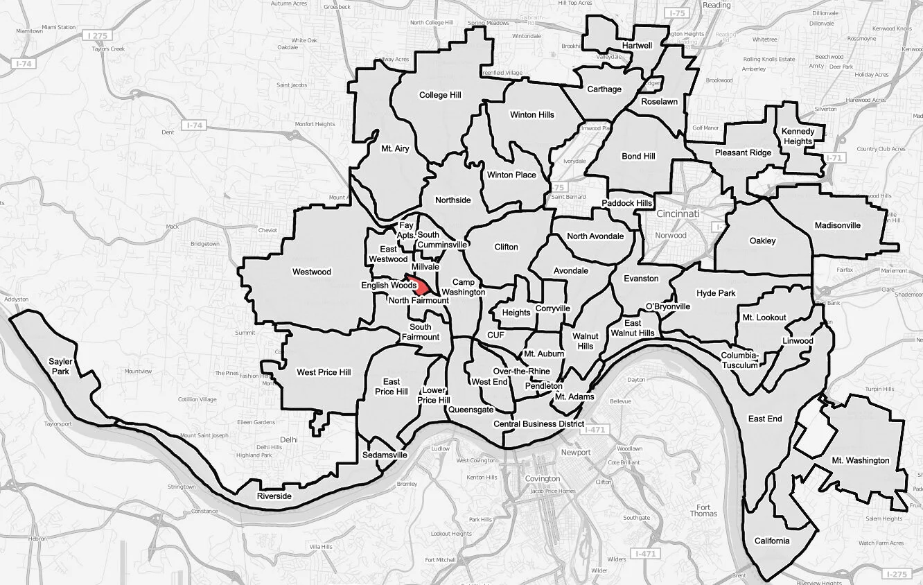 English Woods is a neighborhood located four miles northwest of downtown Cincinnati. Managed by the Cincinnati Metropolitan Housing Authority, this neighborhood has been decimated in the previous two decades and only a resident tower and a couple dozen buildings remain. English Woods needs some love. With 405 residents, English Woods is the 50th largest neighborhood in the City.