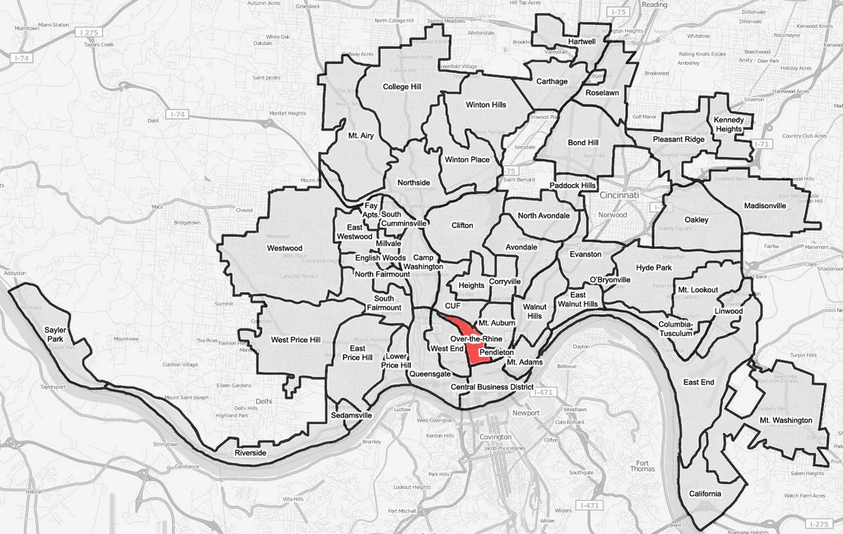 Over-The-Rhine is a neighborhood located one mile north of downtown Cincinnati. The name derives from the neighborhood being north of the old Miami-Erie Canal which, due to the German immigrant population living there, was referred to as the Rhine River. It is home to one of the largest historic districts in the nation and has many shops and restaurants. Washington Park and the stunning Music Hall call this neighborhood home. With 6,064 residents, Over-The-Rhine is the 20th largest neighborhood in the City.