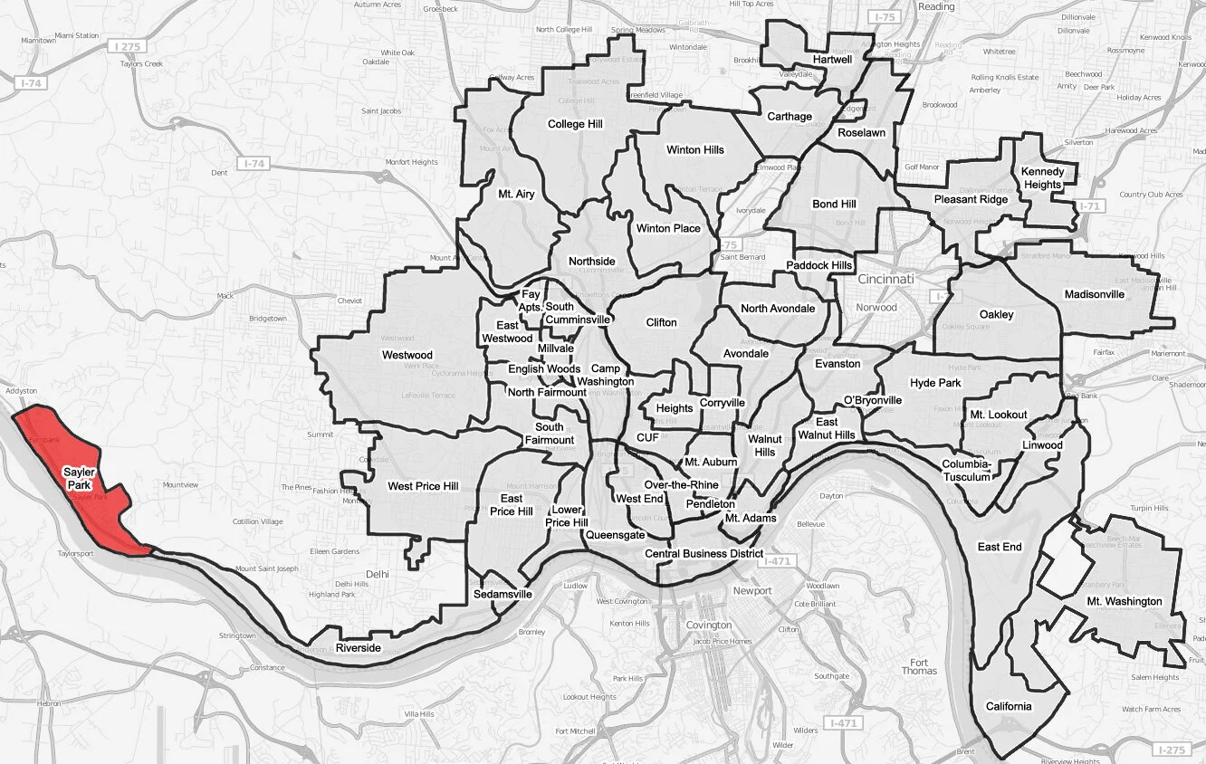 Sayler Park is a neighborhood located eleven miles west of downtown Cincinnati. It is a neighborhood found in a skinny valley along the Ohio River. Home to Fernbank Park and the City’s smallest park, Thornton Triangle, this neighborhood is known for having excellent community events held in its namesake park, Sayler Park. With 2,765 residents, Sayler Park is the 30th largest neighborhood in the City.