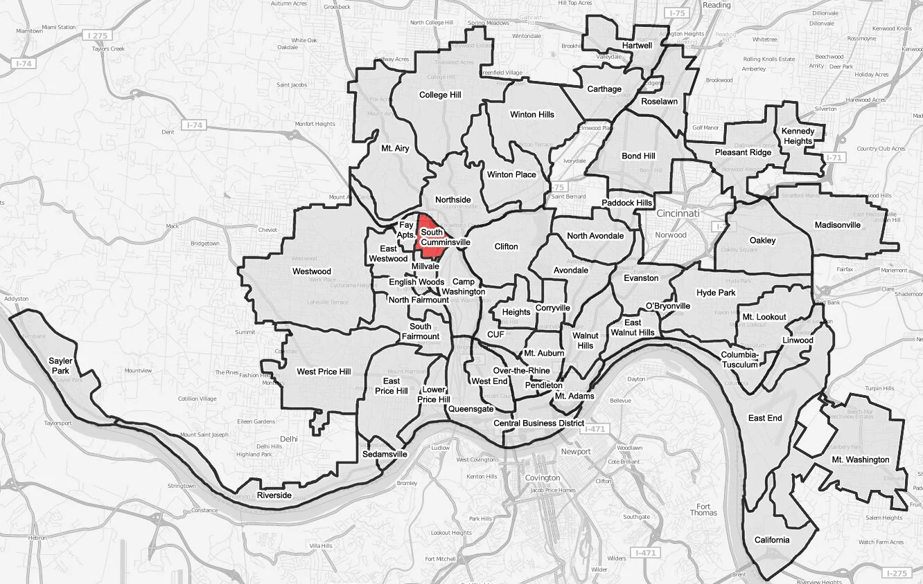 South Cumminsville is a neighborhood located five miles north of downtown Cincinnati. Home to Wayne Playground and Mr. Gene’s Dog House, this neighborhood also has several industrial companies who operate within its boundaries. With 801 residents, South Cumminsville is the 47th largest neighborhood in the City.