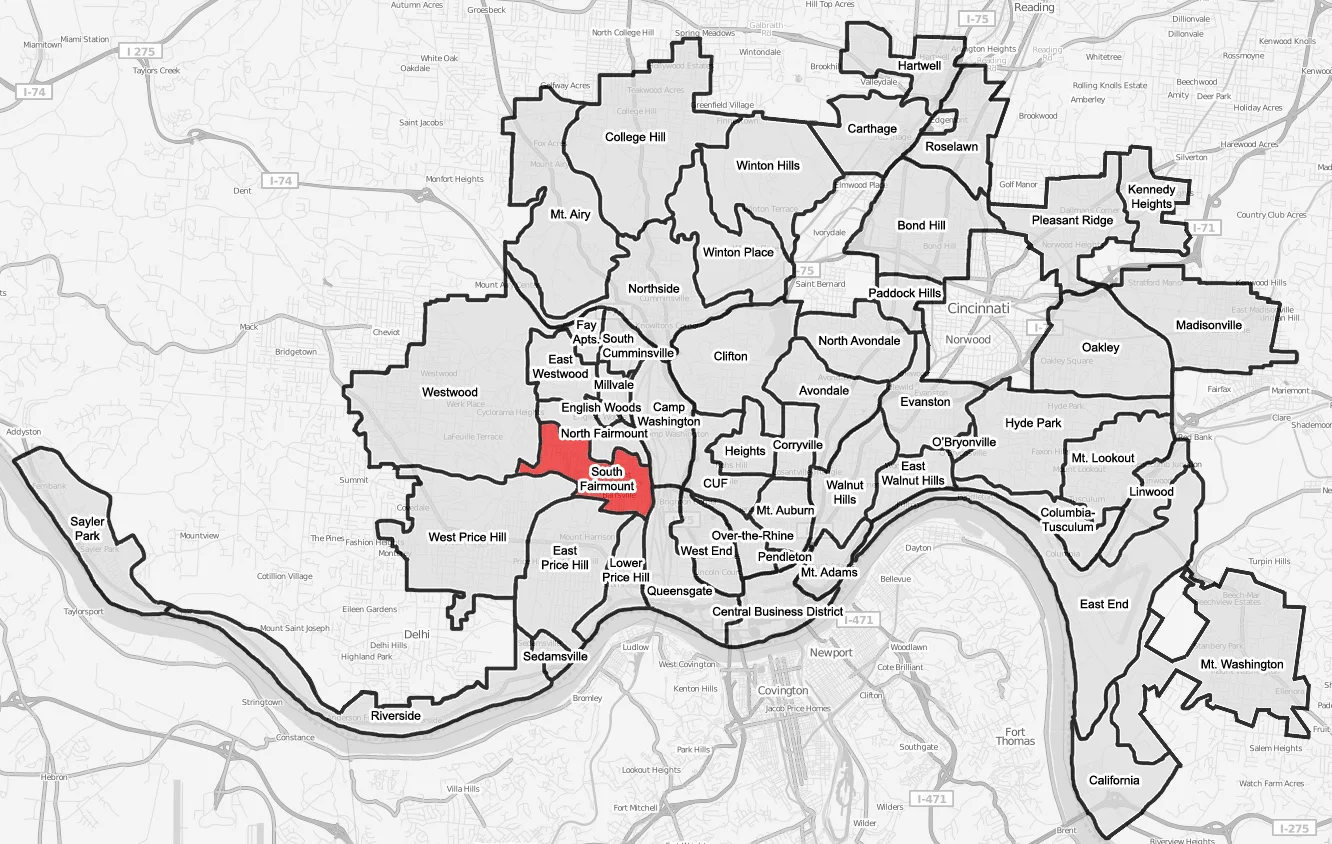 South Fairmount is a neighborhood located just four miles northwest of downtown Cincinnati. The neighborhood was known for its vineyards back in the early 1800’s due to the rocky soil on the slopes of the Lick Run Valley. With 2,368 residents, South Fairmount is the 34th largest neighborhood in the City.